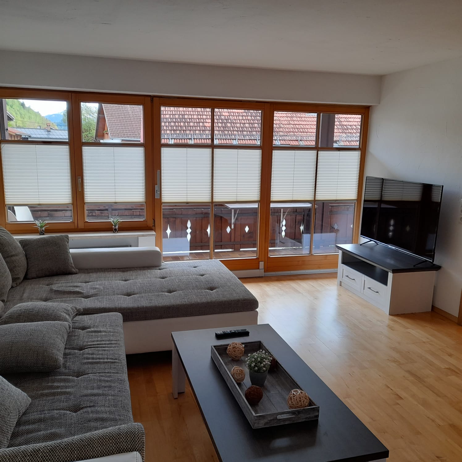 Aus dem Wohn- oder Esszimmer erreicht man den riesigen Balkon, wlecher sich über 2 Hausseiten erstreckt.